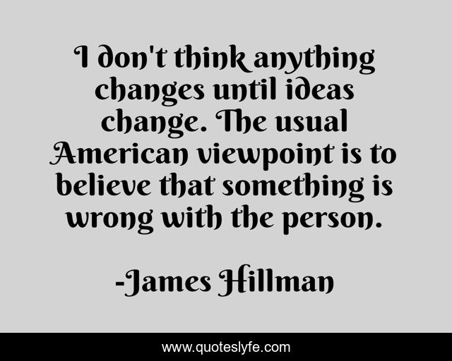 This page presents the quote "I don't think anything changes until ideas change. The usual American viewpoint is to believe that something is wrong with the person.". Author of this quote is James Hillman. This quote is about american, believe, changes,.