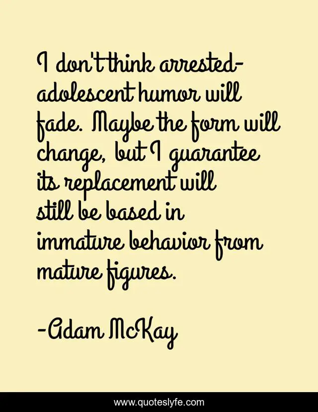 This page presents the quote "I don't think arrested-adolescent humor will fade. Maybe the form will change, but I guarantee its replacement will still be based in immature behavior from mature figures.". Author of this quote is Adam McKay. This quote is about change, behavior, think,.
