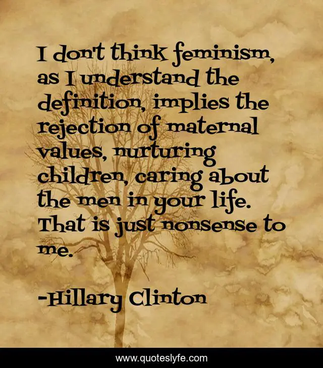 This page presents the quote "I don't think feminism, as I understand the definition, implies the rejection of maternal values, nurturing children, caring about the men in your life. That is just nonsense to me.". Author of this quote is Hillary Clinton. This quote is about caring, life, children,.