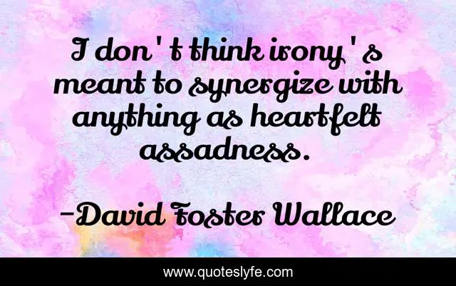 This page presents the quote "I don't think irony's meant to synergize with anything as heartfelt assadness.". Author of this quote is David Foster Wallace. This quote is about irony, sadness, emotions,.