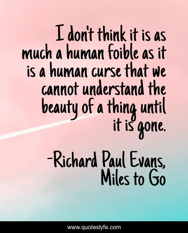 This page presents the quote "I don't think it is as much a human foible as it is a human curse that we cannot understand the beauty of a thing until it is gone.". Author of this quote is Richard Paul Evans, Miles to Go. .