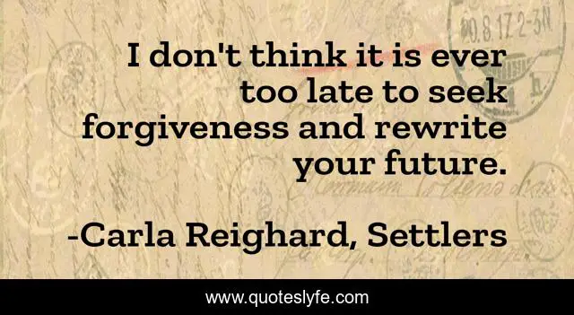 This page presents the quote "I don't think it is ever too late to seek forgiveness and rewrite your future.". Author of this quote is Carla Reighard, Settlers. This quote is about change-your-life, forgiveness-and-letting-go,.