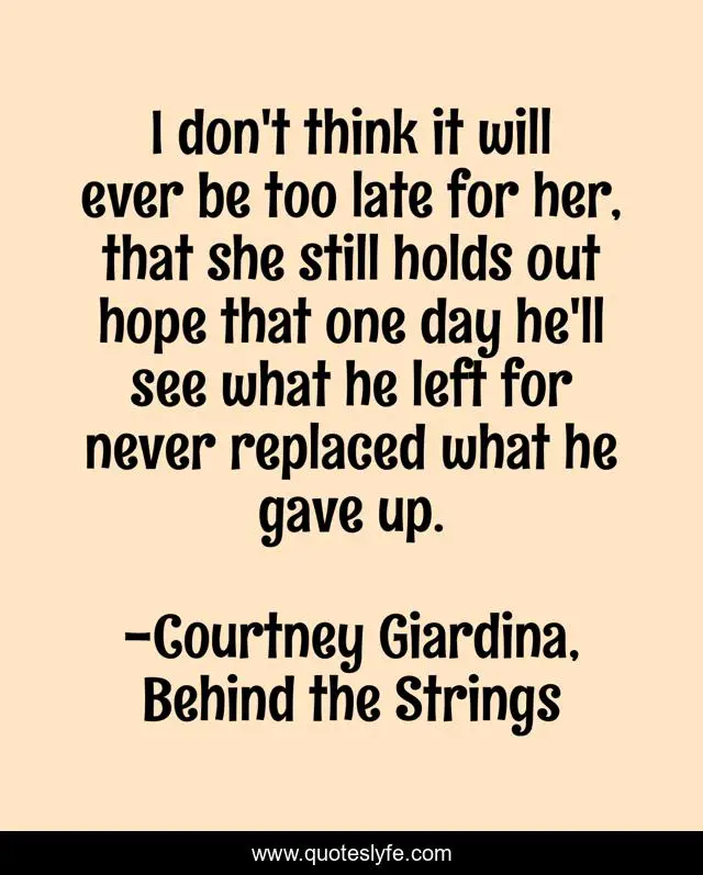 This page presents the quote "I don't think it will ever be too late for her, that she still holds out hope that one day he'll see what he left for never replaced what he gave up.". Author of this quote is Courtney Giardina, Behind the Strings. This quote is about drama, reuinion, second-chances, leaving,.