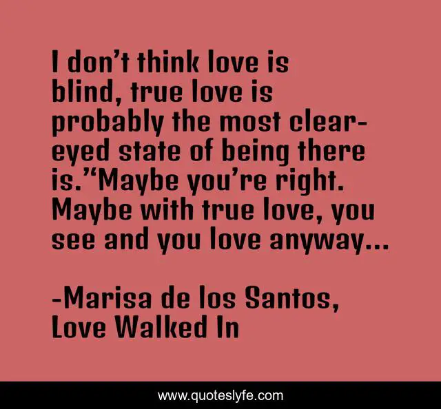 This page presents the quote "I don’t think love is blind, true love is probably the most clear-eyed state of being there is.’‘Maybe you’re right. Maybe with true love, you see and you love anyway…". Author of this quote is Marisa de los Santos, Love Walked In. This quote is about blind, true-love, love, affection,.