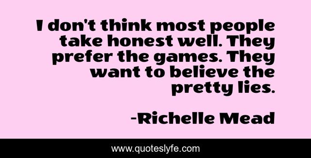 This page presents the quote "I don't think most people take honest well. They prefer the games. They want to believe the pretty lies.". Author of this quote is Richelle Mead. This quote is about storm-born, paranormal,.