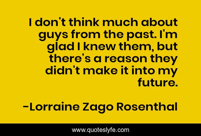 This page presents the quote "I don't think much about guys from the past. I'm glad I knew them, but there's a reason they didn't make it into my future.". Author of this quote is Lorraine Zago Rosenthal. This quote is about lorraine-zago-rosenthal, love, past, future, move-on, guys, affection,.