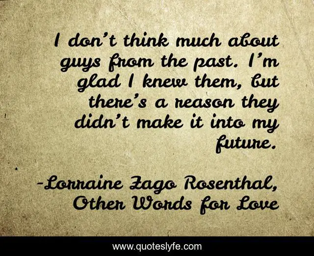This page presents the quote "I don’t think much about guys from the past. I’m glad I knew them, but there’s a reason they didn’t make it into my future.". Author of this quote is Lorraine Zago Rosenthal, Other Words for Love. This quote is about past, future, guys, ex, boyfriends,.