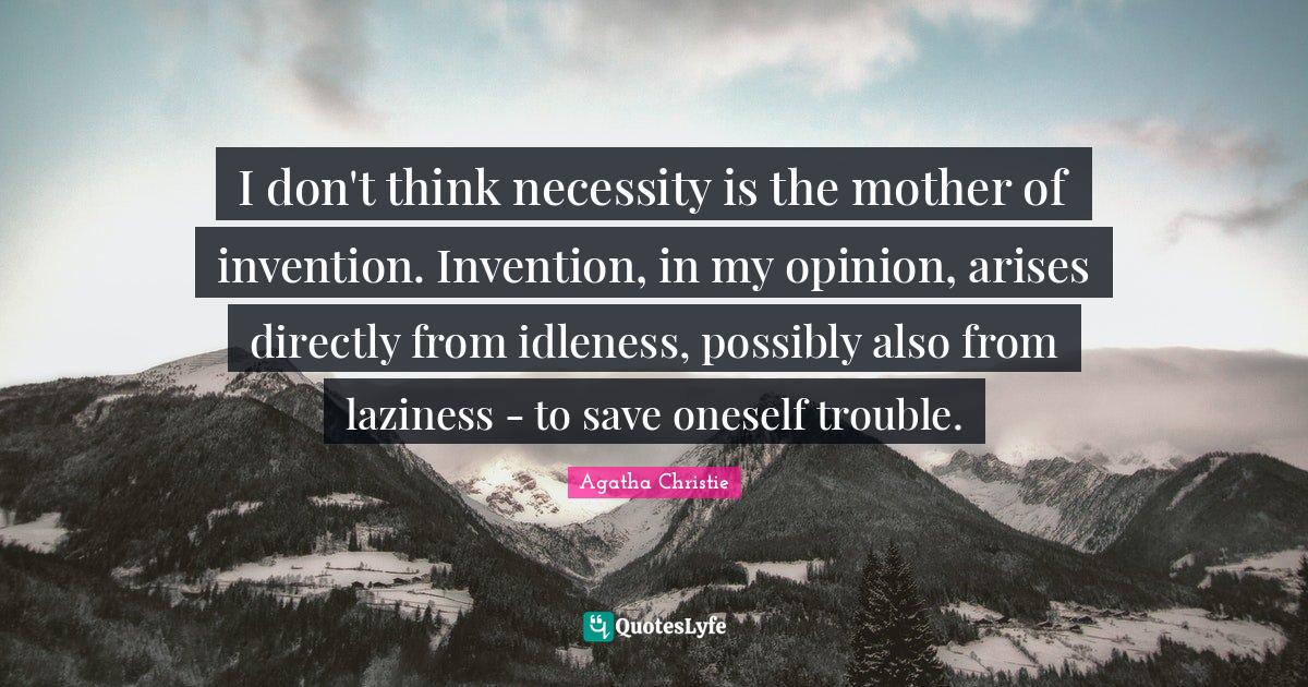 This page presents the quote "I don't think necessity is the mother of invention. Invention, in my opinion, arises directly from idleness, possibly also from laziness - to save oneself trouble.". Author of this quote is Agatha Christie. This quote is about laziness, trouble, memorable, oneself, idleness, thinking, opinion, mother, invention,.
