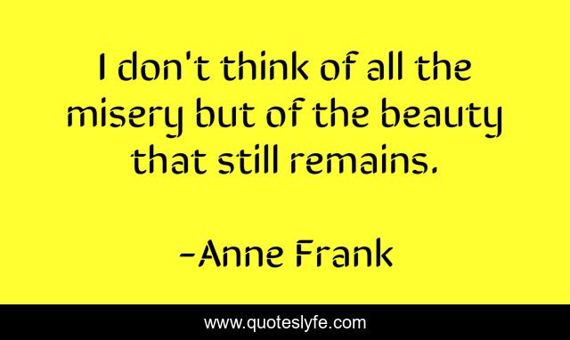 This page presents the quote "I don't think of all the misery but of the beauty that still remains.". Author of this quote is Anne Frank. This quote is about still, think, misery,.