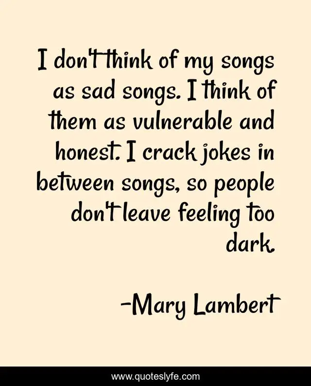 This page presents the quote "I don't think of my songs as sad songs. I think of them as vulnerable and honest. I crack jokes in between songs, so people don't leave feeling too dark.". Author of this quote is Mary Lambert. This quote is about dark, think, people,.