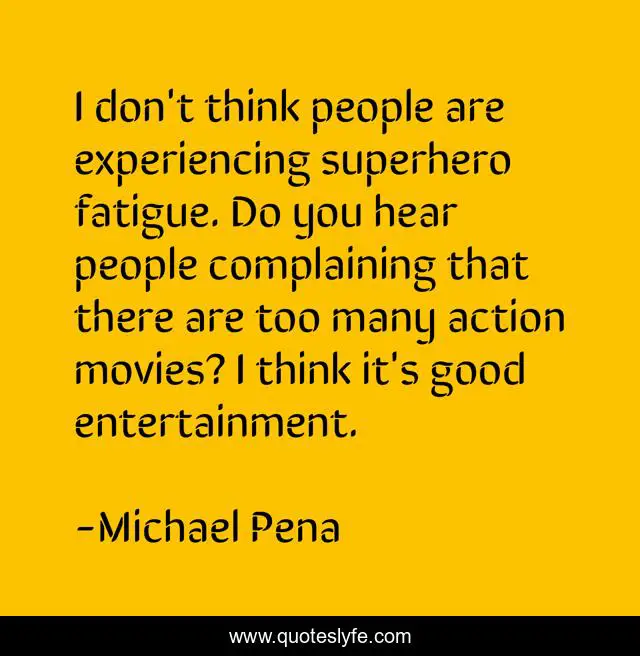 This page presents the quote "I don't think people are experiencing superhero fatigue. Do you hear people complaining that there are too many action movies? I think it's good entertainment.". Author of this quote is Michael Pena. This quote is about action, good, people,.