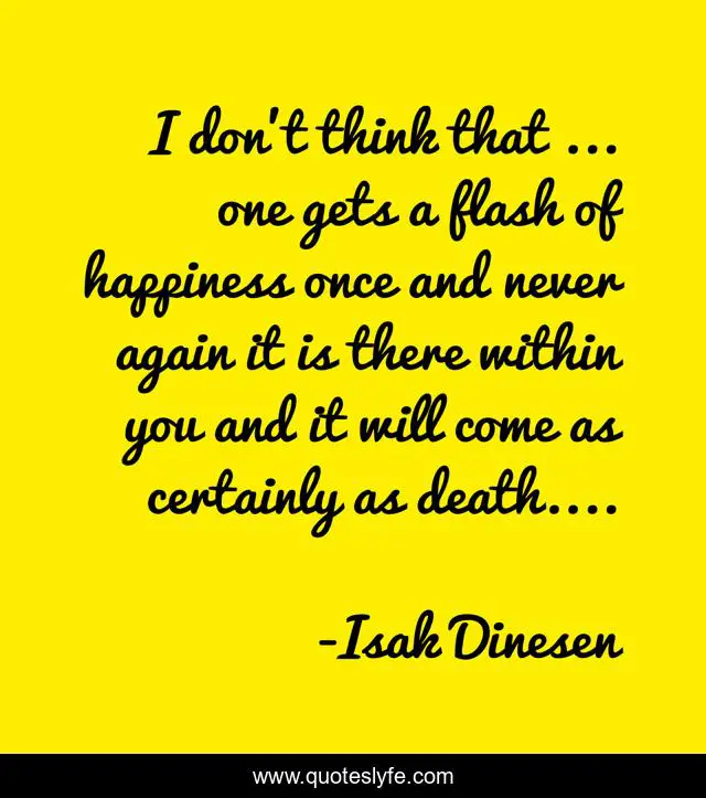 This page presents the quote "I don't think that ... one gets a flash of happiness once and never again it is there within you and it will come as certainly as death....". Author of this quote is Isak Dinesen. This quote is about days, difficult,.