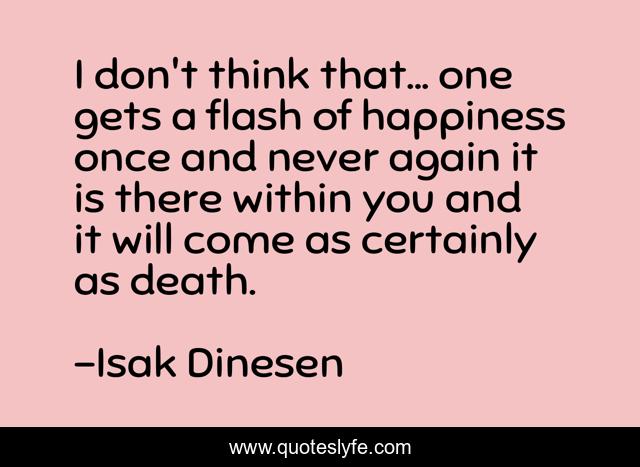 This page presents the quote "I don't think that... one gets a flash of happiness once and never again it is there within you and it will come as certainly as death.". Author of this quote is Isak Dinesen. .