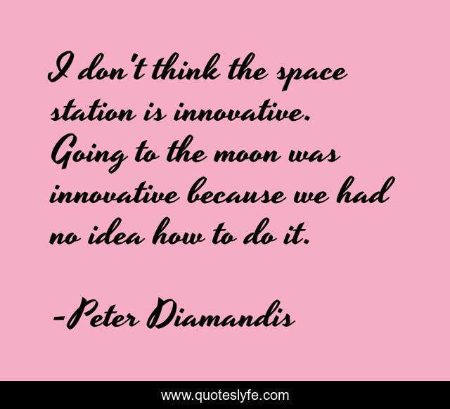 This page presents the quote "I don't think the space station is innovative. Going to the moon was innovative because we had no idea how to do it.". Author of this quote is Peter Diamandis. This quote is about moon, idea, think,.