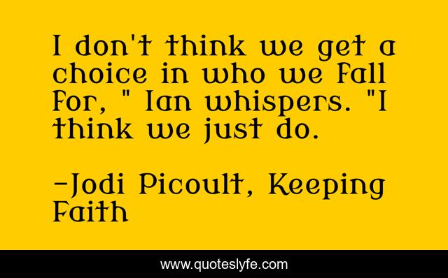 This page presents the quote "I don't think we get a choice in who we fall for, " Ian whispers. "I think we just do.". Author of this quote is Jodi Picoult, Keeping Faith. This quote is about romance, love, affection,.