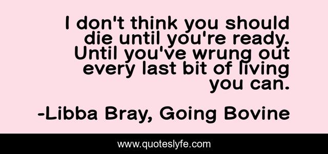 This page presents the quote "I don't think you should die until you're ready. Until you've wrung out every last bit of living you can.". Author of this quote is Libba Bray, Going Bovine. .