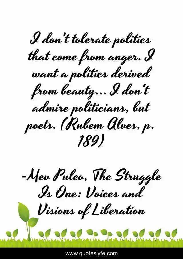 This page presents the quote "I don't tolerate politics that come from anger. I want a politics derived from beauty... I don't admire politicians, but poets. (Rubem Alves, p. 189)". Author of this quote is Mev Puleo, The Struggle Is One: Voices and Visions of Liberation. This quote is about anger, politics, poetry, beauty,.