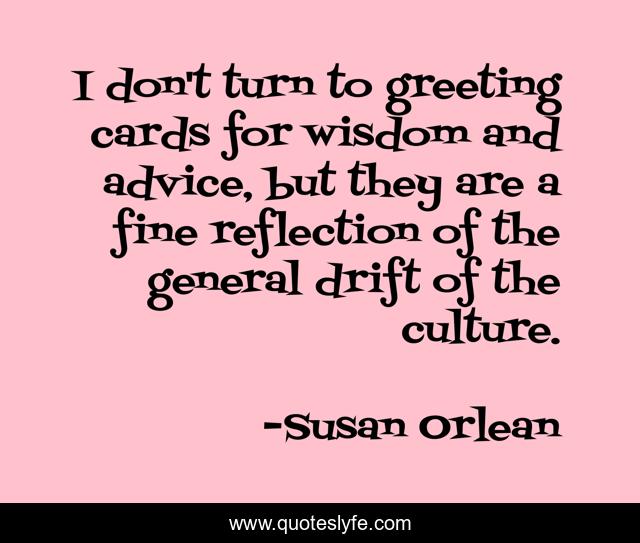 This page presents the quote "I don't turn to greeting cards for wisdom and advice, but they are a fine reflection of the general drift of the culture.". Author of this quote is Susan Orlean. This quote is about culture, advice, reflection,.