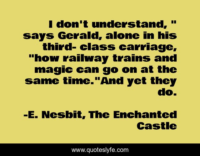 This page presents the quote "I don't understand, " says Gerald, alone in his third- class carriage, "how railway trains and magic can go on at the same time."And yet they do.". Author of this quote is E. Nesbit, The Enchanted Castle. This quote is about magic, reality,.