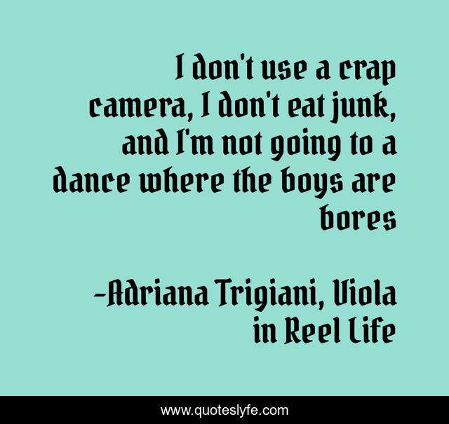 This page presents the quote "I don't use a crap camera, I don't eat junk, and I'm not going to a dance where the boys are bores". Author of this quote is Adriana Trigiani, Viola in Reel Life. This quote is about dance, boys, attitude, humor, behaviour,.