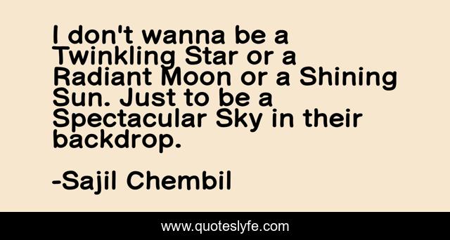 This page presents the quote "I don't wanna be a Twinkling Star or a Radiant Moon or a Shining Sun. Just to be a Spectacular Sky in their backdrop.". Author of this quote is Sajil Chembil. This quote is about fantasy, dream,.