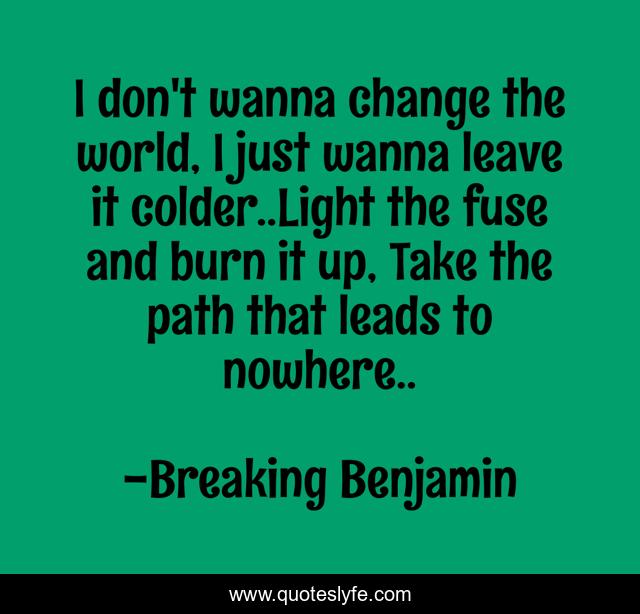 This page presents the quote "I don't wanna change the world, I just wanna leave it colder..Light the fuse and burn it up, Take the path that leads to nowhere..". Author of this quote is Breaking Benjamin. This quote is about colder, leave, change-the-world, fuse, nowhere, path, world, change, endless,.