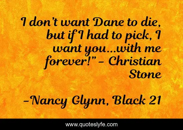 This page presents the quote "I don’t want Dane to die, but if I had to pick, I want you...with me forever!” - Christian Stone". Author of this quote is Nancy Glynn, Black 21. .