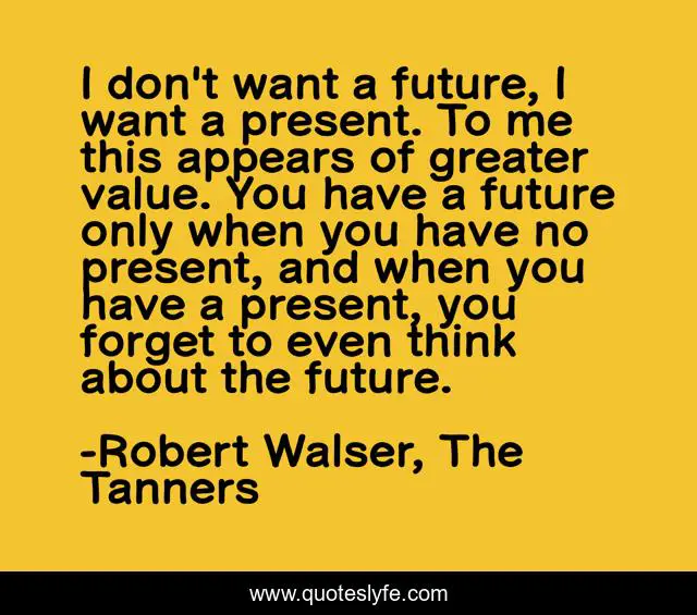 This page presents the quote "I don't want a future, I want a present. To me this appears of greater value. You have a future only when you have no present, and when you have a present, you forget to even think about the future.". Author of this quote is Robert Walser, The Tanners. This quote is about future, present, value,.