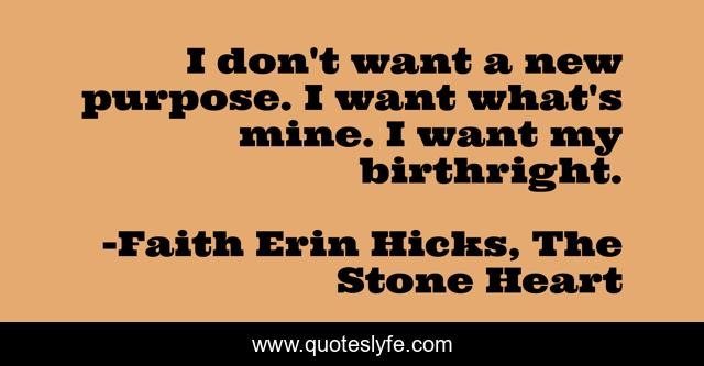 This page presents the quote "I don't want a new purpose. I want what's mine. I want my birthright.". Author of this quote is Faith Erin Hicks, The Stone Heart. This quote is about fool, birthright, liar, the-nameless-city, the-stone-heart, erzi, purpose, sins-of-the-father, lying,.