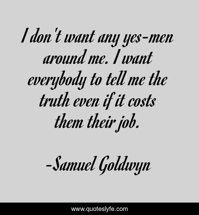 This page presents the quote "I don't want any yes-men around me. I want everybody to tell me the truth even if it costs them their job.". Author of this quote is Samuel Goldwyn. This quote is about me, job,.