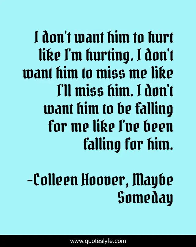 This page presents the quote "I don't want him to hurt like I'm hurting. I don't want him to miss me like I'll miss him. I don't want him to be falling for me like I've been falling for him.". Author of this quote is Colleen Hoover, Maybe Someday. This quote is about falling, hurt,.