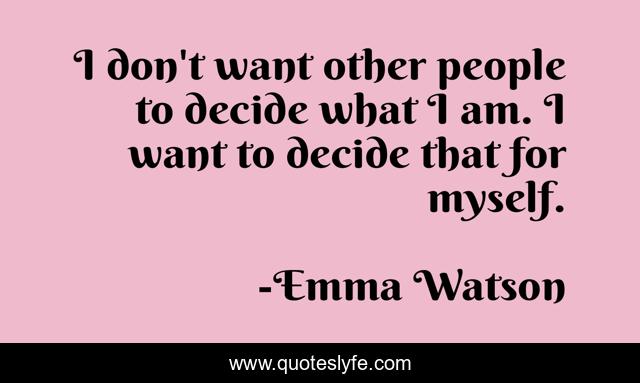 This page presents the quote "I don't want other people to decide what I am. I want to decide that for myself.". Author of this quote is Emma Watson. This quote is about enthusiasm, myself, decide, empowerment, inspirational,.