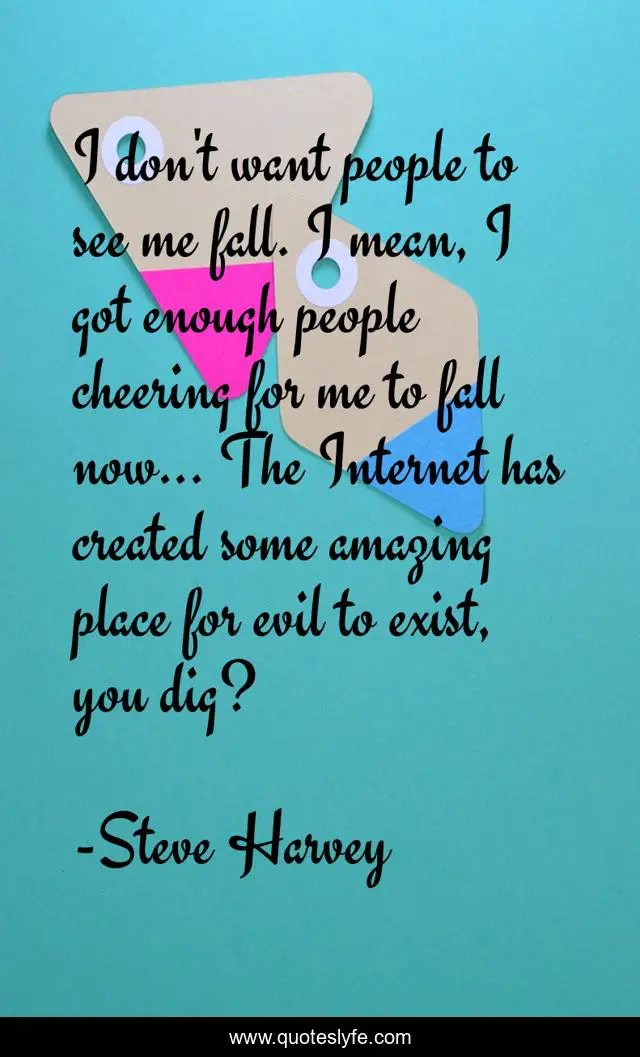 This page presents the quote "I don't want people to see me fall. I mean, I got enough people cheering for me to fall now... The Internet has created some amazing place for evil to exist, you dig?". Author of this quote is Steve Harvey. This quote is about internet, evil, fall,.