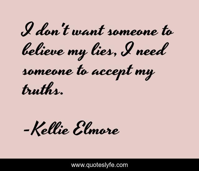 This page presents the quote "I don't want someone to believe my lies, I need someone to accept my truths.". Author of this quote is Kellie Elmore. This quote is about self-awareness, self-discovery, self-empowerment, self-help, truth-and-lies, self-esteem,.