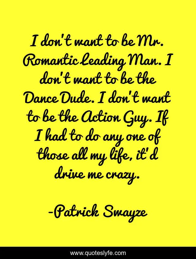 This page presents the quote "I don't want to be Mr. Romantic Leading Man. I don't want to be the Dance Dude. I don't want to be the Action Guy. If I had to do any one of those all my life, it'd drive me crazy.". Author of this quote is Patrick Swayze. This quote is about dance, life, man,.