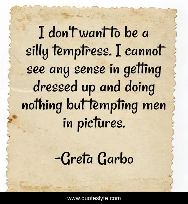 This page presents the quote "I don't want to be a silly temptress. I cannot see any sense in getting dressed up and doing nothing but tempting men in pictures.". Author of this quote is Greta Garbo. This quote is about see, silly,.
