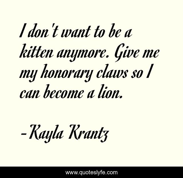 This page presents the quote "I don't want to be a kitten anymore. Give me my honorary claws so I can become a lion.". Author of this quote is Kayla Krantz. This quote is about enthusiasm, motivation, strength, inspirational,.