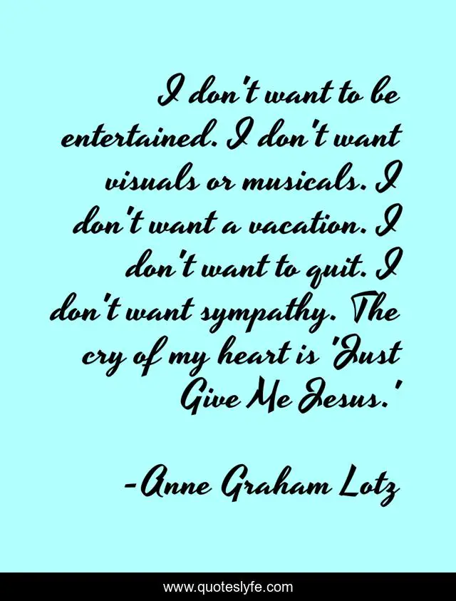 This page presents the quote "I don't want to be entertained. I don't want visuals or musicals. I don't want a vacation. I don't want to quit. I don't want sympathy. The cry of my heart is 'Just Give Me Jesus.'". Author of this quote is Anne Graham Lotz. This quote is about me, heart, vacation,.