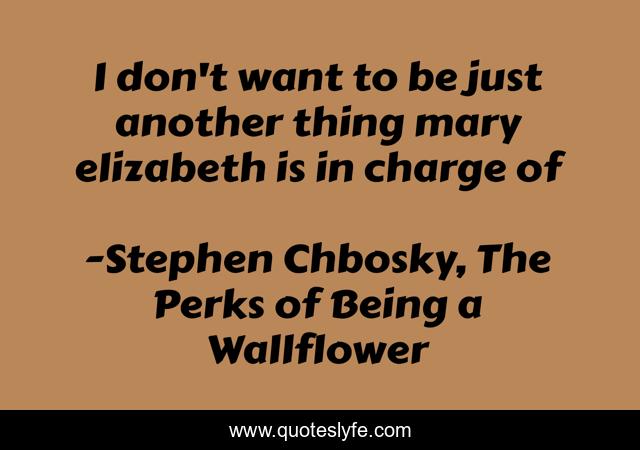 This page presents the quote "I don't want to be just another thing mary elizabeth is in charge of". Author of this quote is Stephen Chbosky, The Perks of Being a Wallflower. This quote is about selfishness, love, relationship, affection,.