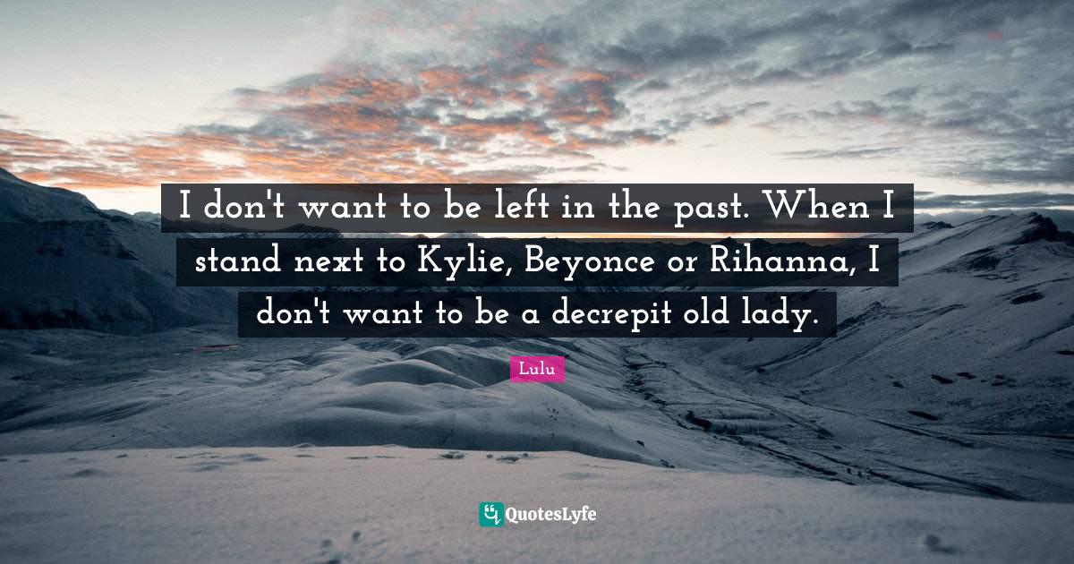 This page presents the quote "I don't want to be left in the past. When I stand next to Kylie, Beyonce or Rihanna, I don't want to be a decrepit old lady.". Author of this quote is Lulu. This quote is about next, beyonce, left, decrepit, past, old lady,.