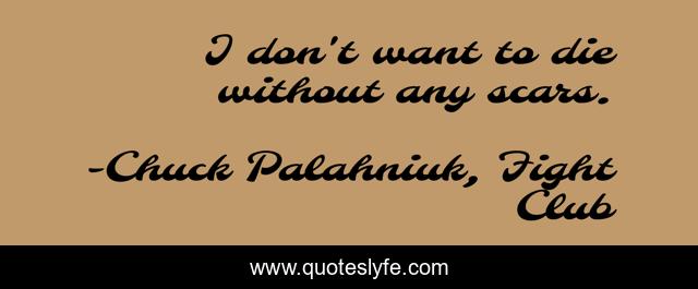 This page presents the quote "I don't want to die without any scars.". Author of this quote is Chuck Palahniuk, Fight Club. This quote is about tyler-durden, death, scars,.