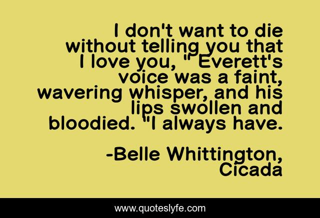 This page presents the quote "I don't want to die without telling you that I love you, " Everett's voice was a faint, wavering whisper, and his lips swollen and bloodied. "I always have.". Author of this quote is Belle Whittington, Cicada. This quote is about sci-fi, paranormal-series, paranormal-ya,.