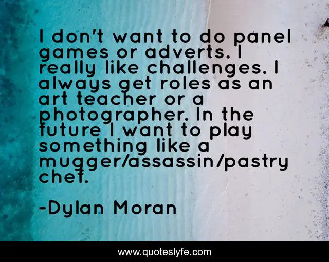 This page presents the quote "I don't want to do panel games or adverts. I really like challenges. I always get roles as an art teacher or a photographer. In the future I want to play something like a mugger/assassin/pastry chef.". Author of this quote is Dylan Moran. This quote is about challenges, future, art,.