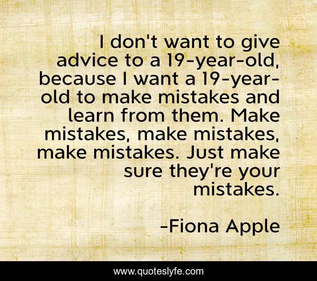 This page presents the quote "I don't want to give advice to a 19-year-old, because I want a 19-year-old to make mistakes and learn from them. Make mistakes, make mistakes, make mistakes. Just make sure they're your mistakes.". Author of this quote is Fiona Apple. This quote is about mistakes, life, musician, learning,.