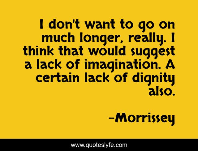 This page presents the quote "I don't want to go on much longer, really. I think that would suggest a lack of imagination. A certain lack of dignity also.". Author of this quote is Morrissey. This quote is about dignity, think,.