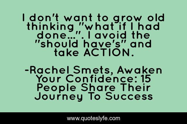 This page presents the quote "I don't want to grow old thinking ''what if I had done...''. I avoid the ''should have's'' and take ACTION.". Author of this quote is Rachel Smets, Awaken Your Confidence: 15 People Share Their Journey To Success. This quote is about confidence, positive, motivational, quotes, optimistic, inspirational, enthusiasm,.