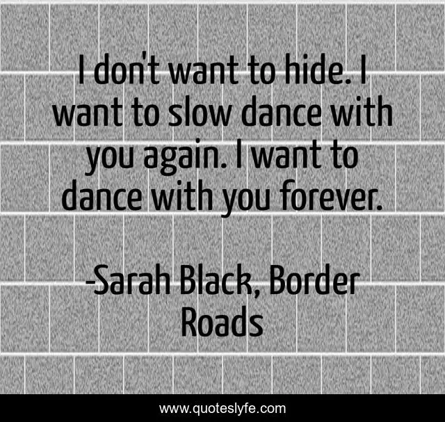 This page presents the quote "I don't want to hide. I want to slow dance with you again. I want to dance with you forever.". Author of this quote is Sarah Black, Border Roads. This quote is about dance, forever, love, affection,.
