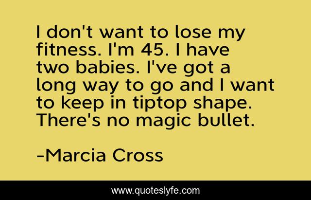 This page presents the quote "I don't want to lose my fitness. I'm 45. I have two babies. I've got a long way to go and I want to keep in tiptop shape. There's no magic bullet.". Author of this quote is Marcia Cross. This quote is about magic, long,.