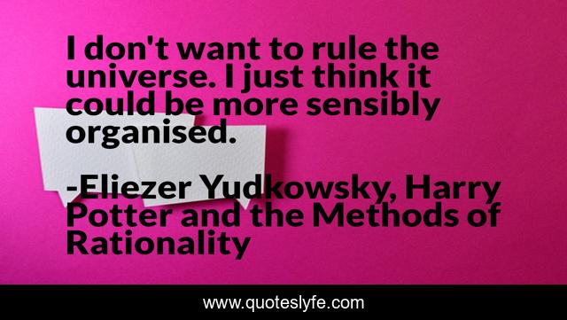 This page presents the quote "I don't want to rule the universe. I just think it could be more sensibly organised.". Author of this quote is Eliezer Yudkowsky, Harry Potter and the Methods of Rationality. This quote is about dark-side, organisation, universe, rule-the-world, sense,.