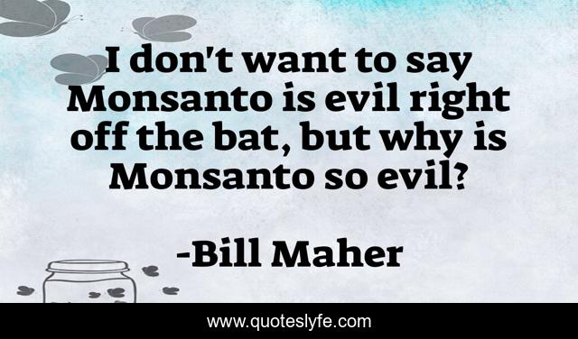This page presents the quote "I don't want to say Monsanto is evil right off the bat, but why is Monsanto so evil?". Author of this quote is Bill Maher. This quote is about science, chemicals, monsanto, evil, real-time-with-bill-maher,.
